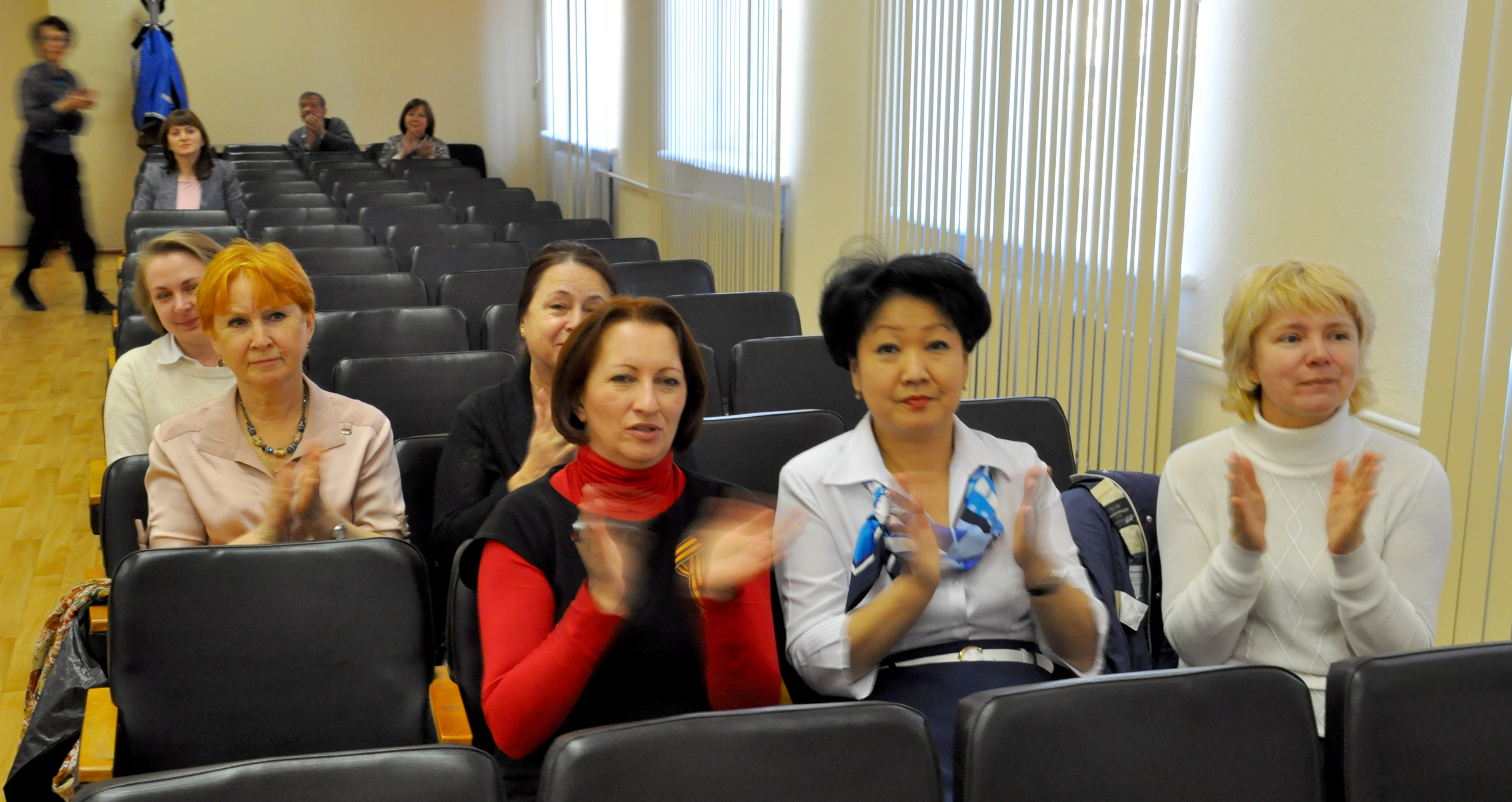 2015 год, 8 мая. В конференц-зале Института физики им. Л.В. Киренского Сибирского отделения Российской академии наук перед концертом, посвященным 70-тию Победы в Великой Отечественной войне (1941-1945 гг.). В первом ряду (слева направо): Бондарева Е.В., Ли Л.А., . Серёдкина Ж.В. Во втором ряду: Косолапова Л.Г. (слева) Дрокина Т.В. В третьем ряду: Михалева ЕА. Далее: Прищепа О.О., Гуняков В.А, Лукина И.П. Красноярск.