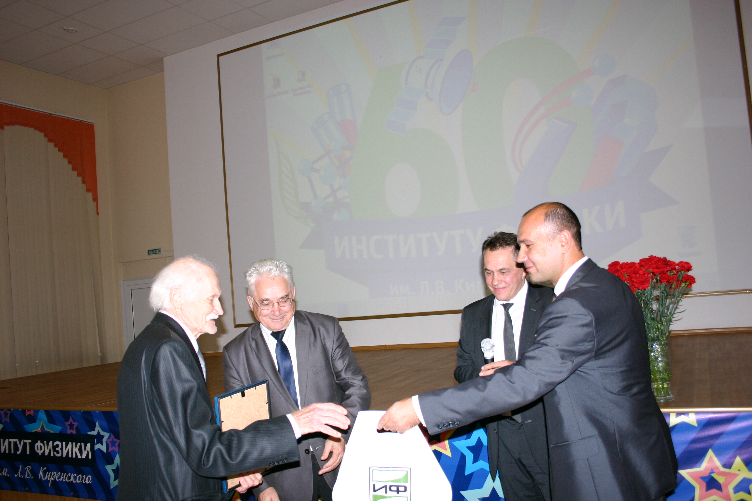 12 октября 2016 года в конференц-зале Института физики им. Л.В. Киренского Сибирского отделения Российской академии наук (ИФ СО РАН) проходило расширенное заседание ученого Совета, посвященное 60-летию образования института с участием сотрудников института, представителей администраций города и края, директоров предприятий-партнеров, директоров подразделений Федерального исследовательского центра "Красноярский научный центр Сибирского отделения Российской академии наук" (ФИЦ КНЦ СО РАН) и других гостей.Благодарственное письмо дирекции института вручается Игорю Александровичу Турпанову, старшему научному сотруднику лаборатории магнитодинамики. Слева направо: И.А. Турпанов, В.Ф. Шабанов, Н.В. Волков, С.И. Попков. Красноярск.
