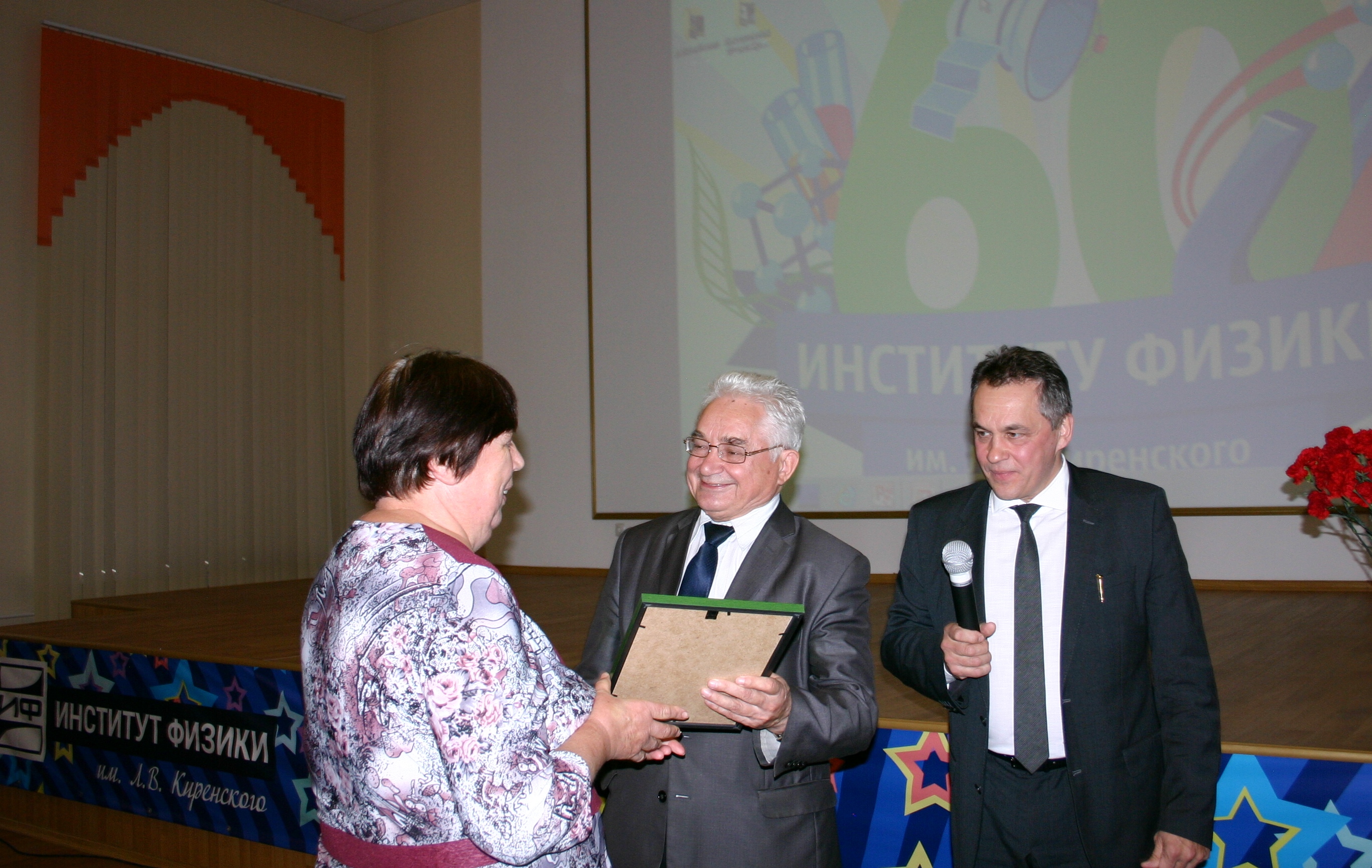 12 октября 2016 года в конференц-зале в Институте физики им. Л.В. Киренского Сибирского отделения Российской академии наук (ИФ СО РАН) проходило расширенное заседание ученого Совета, посвященное 60-летию образования института с участием сотрудников института, представителей администраций города и края, директоров предприятий-партнеров, директоров подразделений Федерального исследовательского центра "Красноярский научный центр СО РАН" (ФИЦ КНЦ СО РАН) и других гостей. Благодарственное письмо дирекции института вручается Нине Петровне Будюкиной, бухгалтеру института. Слева направо: Будюкина Н.П., Шабанов В.Ф., Волков Н.В. Красноярск.
