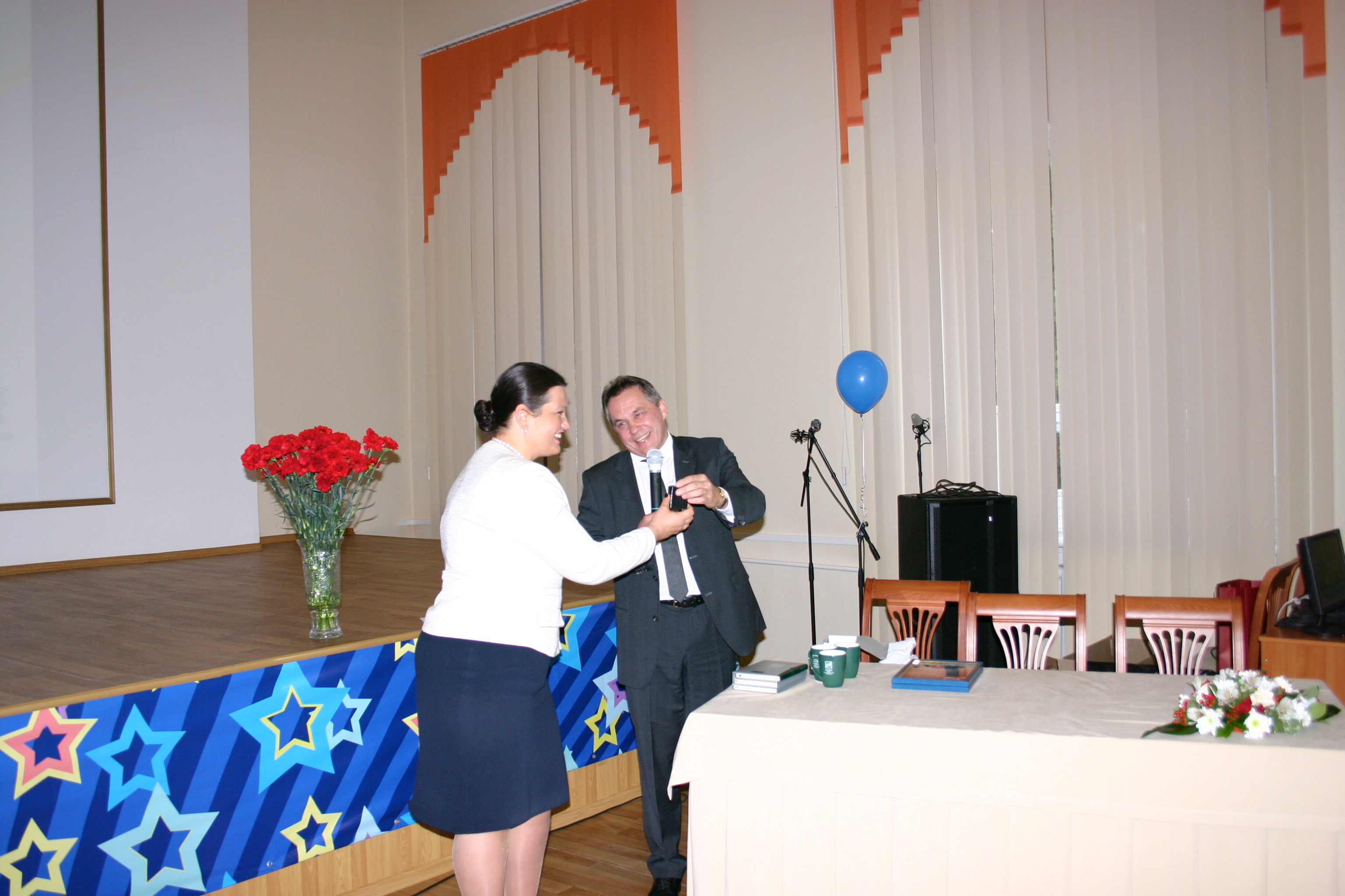 12 октября 2016 года в конференц-зале Института физики им. Л.В. Киренского Российской академии наук (ИФ СО РАН) проходило расширенное заседание ученого Совета, посвященное 60-летию образования института с участием сотрудников института, представителей администраций города и края, директоров предприятий-партнеров, директоров подразделений ФИЦ КНЦ СО РАН и других гостей. Директор ИФ СО РАН Волков Н.В. вручает Н.В. Рязанцевой, заместителю председателя правительства Красноярского края, памятный сувенир.