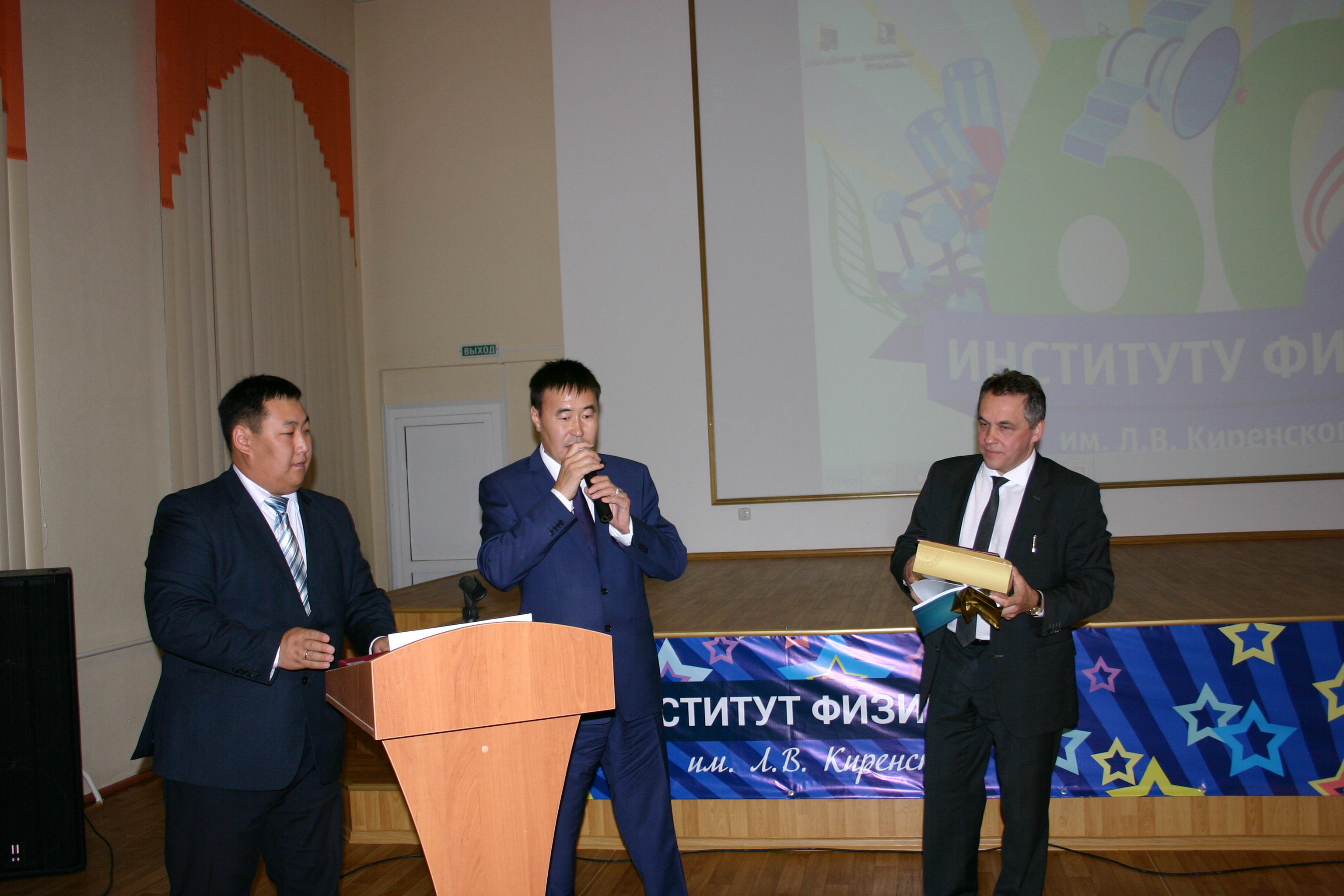 12 октября 2016 года конференц-зале Института физики им. Л.В. Киренского Сибирского отделения Российской академии наук (ИФ СО РАН) проходило расширенное заседание ученого Совета, посвященное 60-летию образования института с участием сотрудников института, представителей администраций города и края, директоров предприятий-партнеров, директоров подразделений ФИЦ КНЦ СО РАН и других гостей. Директор ИФ СО РАН Волков Н.В. принимает поздравления от гостей из Амгинского улуса (село Амга в Якутии является малой Родиной Л.В. Киренского, организатора и первого директора Института физики). Слева направо: Ю.Е. Шишигин, начальник управления образования Амгинского улуса; П.И. Лебедев, первый заместитель главы администрации Амгинского улуса Республика Саха (Якутия). Красноярск.