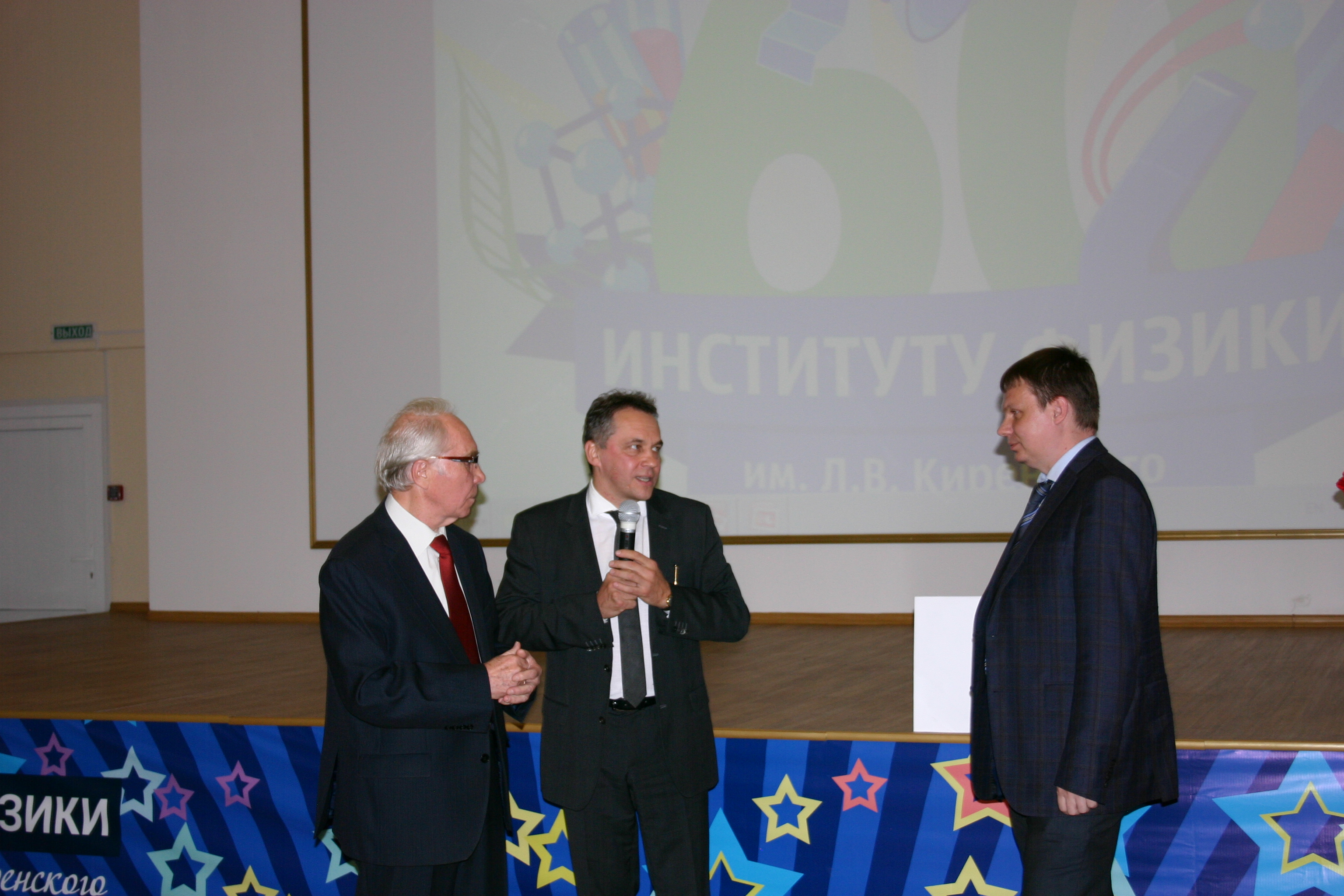 12 октября 2016 года в конференц-зале Института физики им. Л.В. Киренского Сибирского отделения Российской академии наук (ИФ СО РАН) проходило расширенное заседание ученого Совета, посвященное 60-летию образования института с участием сотрудников института, представителей администраций города и края, директоров предприятий-партнеров, директоров подразделений ФИЦ КНЦ СО РАН и других гостей. Директор ИФ СО РАН Волков Н.В. (в центре) принимает поздравления от Е.Н. Головёнкина, главного ученого секретаря Научно-технического совета ОАО ИСС им. М.Ф. Решетнева (слева) и К.Г. Охоткина, заместителя координатора ТП «НИСС» (Сибирский государственный аэрокосмический университет им. М.Ф. Решетнева). Красноярск.