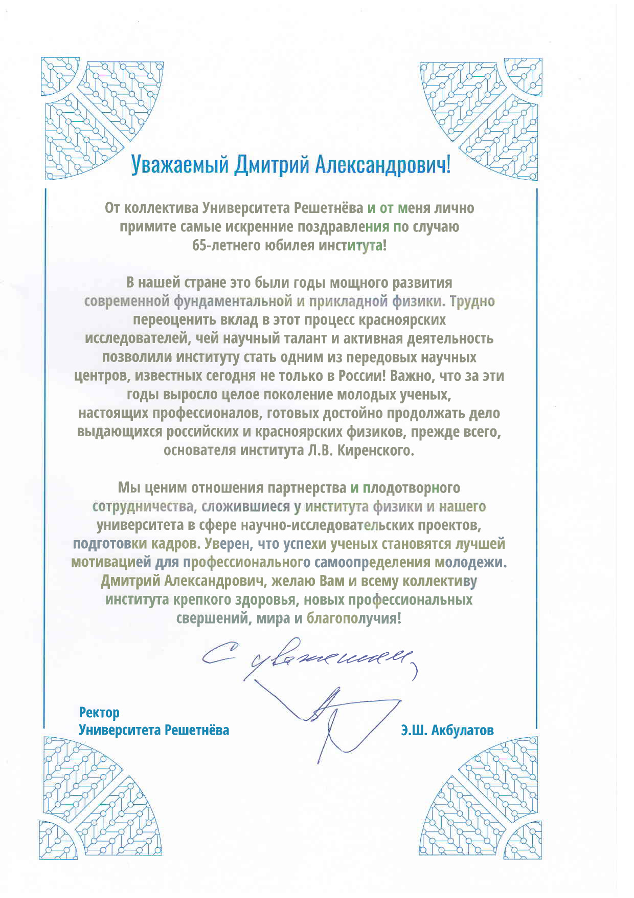 Поздравление от Сибирского государственного аэрокосмического университета им. Решетнёва