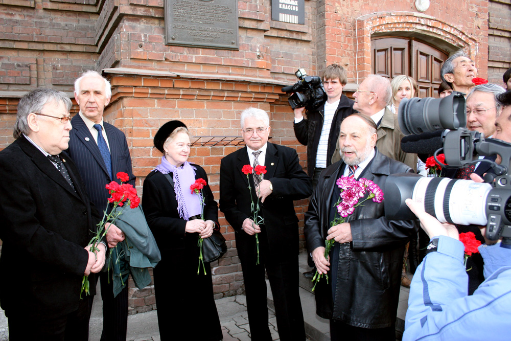 9 апреля 2009 года. У здания Красноярского государственного педагогического университета. Слева направо: А. Ф. САФРОНОВ, С. Г. ОВЧИННИКОВ, Т. Л. ОВЧИННИКОВА (дочь Киренского); академик В. Ф. ШАБАНОВ, Н. И. ДРОЗДОВ, в день 100-ия академика Л.В. Киренского, организатора и первого директора Института физики им. Л.В. Киренского Сибирского отделения Российской академии наук (ИФ СО РАН). Возложены цветы к мемориальной доске Л.В. Киренского на здании университета, в котором Леонид Васильевич начинал свою трудовую деятельность в Красноярске в 1940 году.