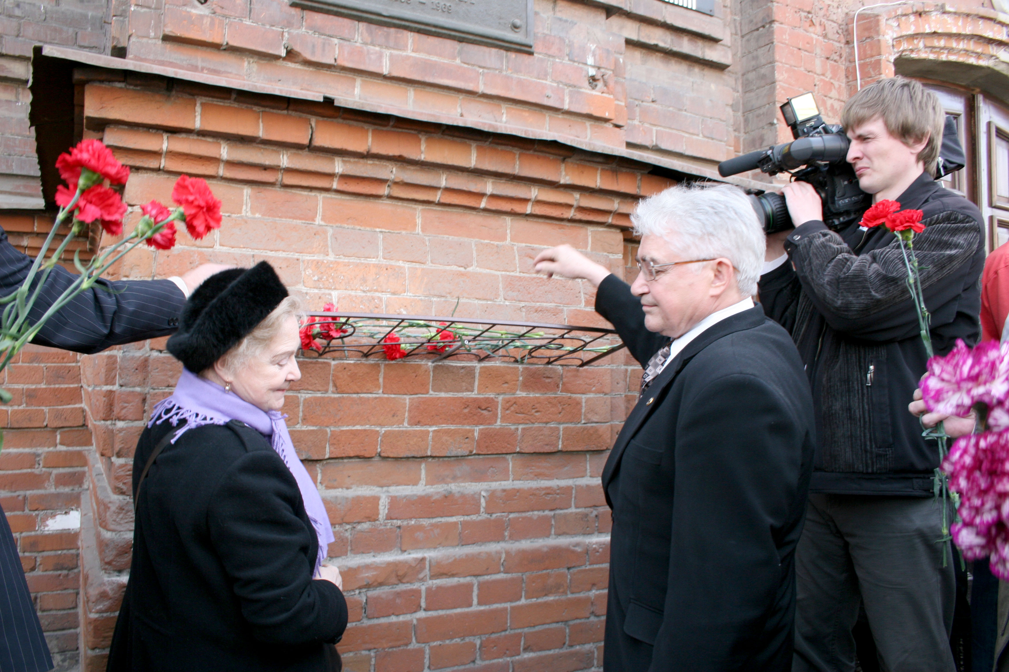 В день 100-тия со дня рождения академика Л.В. Киренского, организатора и первого директора Института физики им. Л.В. Киренского Сибирского отделения Российской академии наук (ИФ СО РАН), В.Ф. Шабанов, директор Института физики, вместе с дочерью Леонида Васильевича Татьяной Овчинниковой возлагают цветы у мемориальной доски Киренского на здании Красноярского педагогического университета 9 апреля 2009 года.