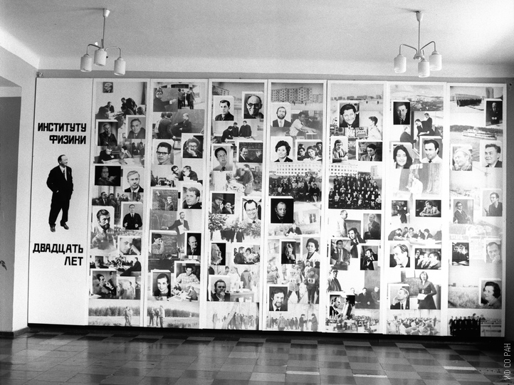 Фотостенд «Годы и люди», изготовленный Безносиковым Б.В., научным сотрудником лаборатории кристаллофизики к двадцатилетию образования Института физики Сибирского отделения Академии наук СССР (ИФ СО АН СССР). Фото 1976 года. Красноярск.