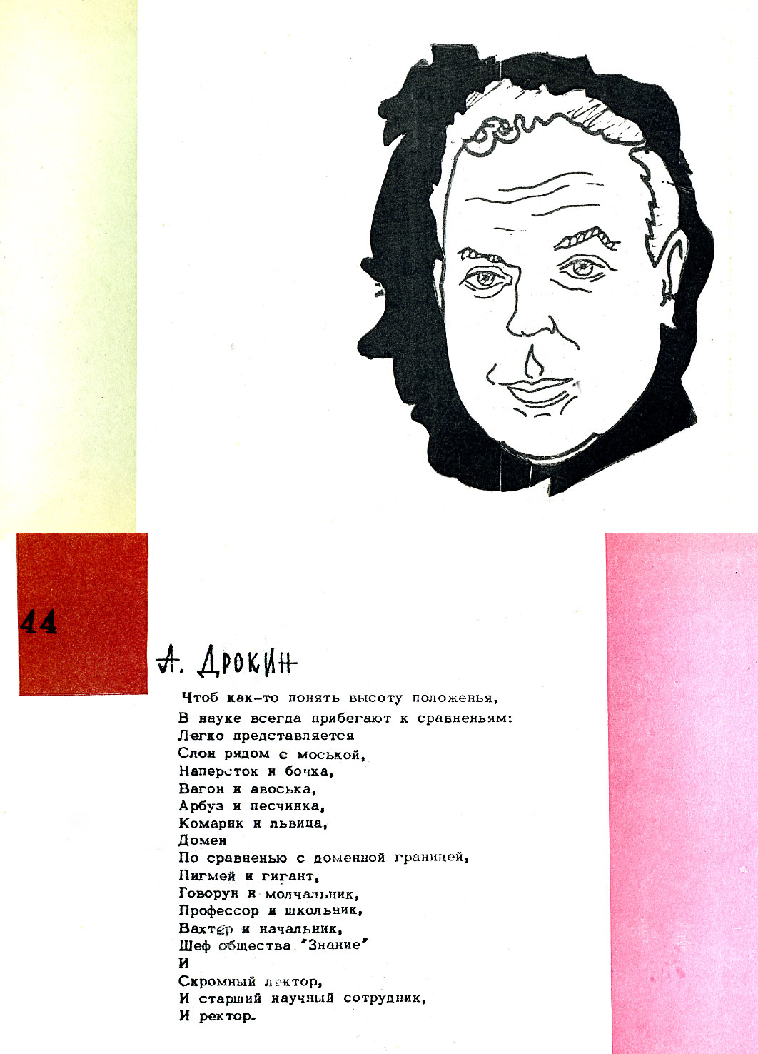 Дружеский шарж Дрокина А.И. из книги "Музей друзей", изданной научными сотрудниками Института физики Сибирского отделения Академии наук СССР (ИФ СО АН СССР) Олегом Артемьевичем Баюковым и Николаем Сергеевичем Чистяковым. Удивительная книжка дружеских шаржей и эпиграмм на сотрудников Института физики СО АН СССР. Она вышла в 1967 году к 10-летию начала работы института. Вышла небольшим тиражом в 100 экземпляров и распространялась строго по списку, лично в руки. Узнать себя на страницах книги смогли 48 самых ярких и заметных личностей молодого института. Позже (в 1971 году) вышла вторая книга под таким же названием. Что побудило их взяться за такой труд, авторы подробно изложили в предисловии к первой и второй книгам. Книги размещены на сайте.