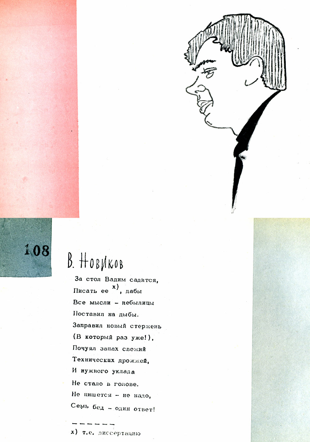 Дружеский шарж Нвикова В. из книги "Музей друзей", изданной научными сотрудниками Института физики Сибирского отделения Академии наук СССР (ИФ СО АН СССР) Олегом Артемьевичем Баюковым и Николаем Сергеевичем Чистяковым. Удивительная книжка дружеских шаржей и эпиграмм на сотрудников Института физики СО АН СССР. Она вышла в 1967 году к 10-летию начала работы института. Вышла небольшим тиражом в 100 экземпляров и распространялась строго по списку, лично в руки. Узнать себя на страницах книги смогли 48 самых ярких и заметных личностей молодого института. Позже (в 1971 году) вышла вторая книга под таким же названием. Что побудило их взяться за такой труд, авторы подробно изложили в предисловии к первой и второй книгам. Книги размещены на сайте.